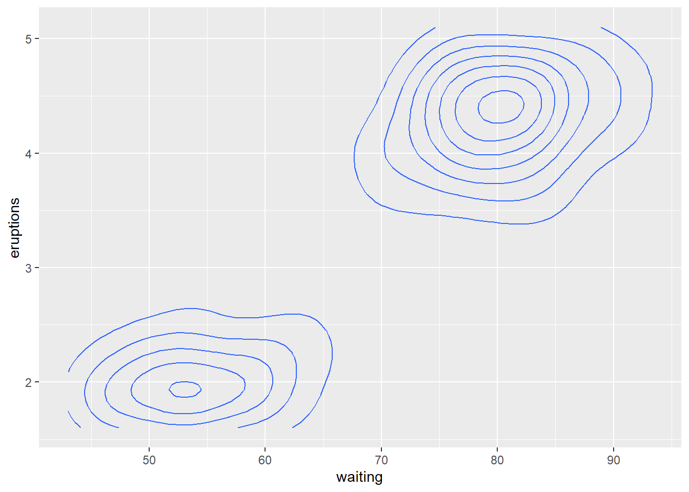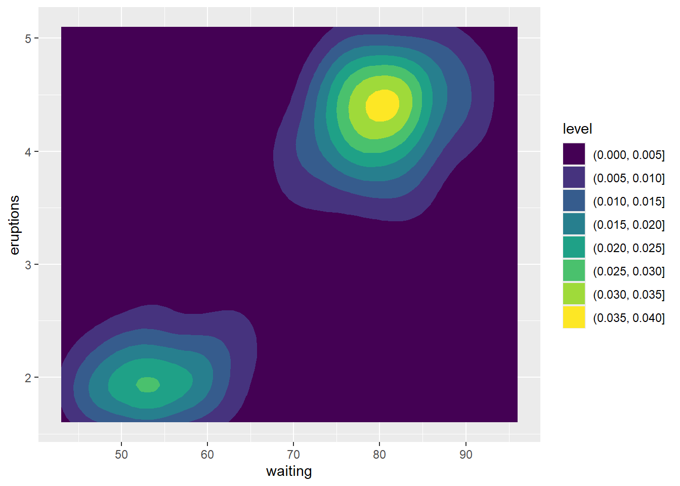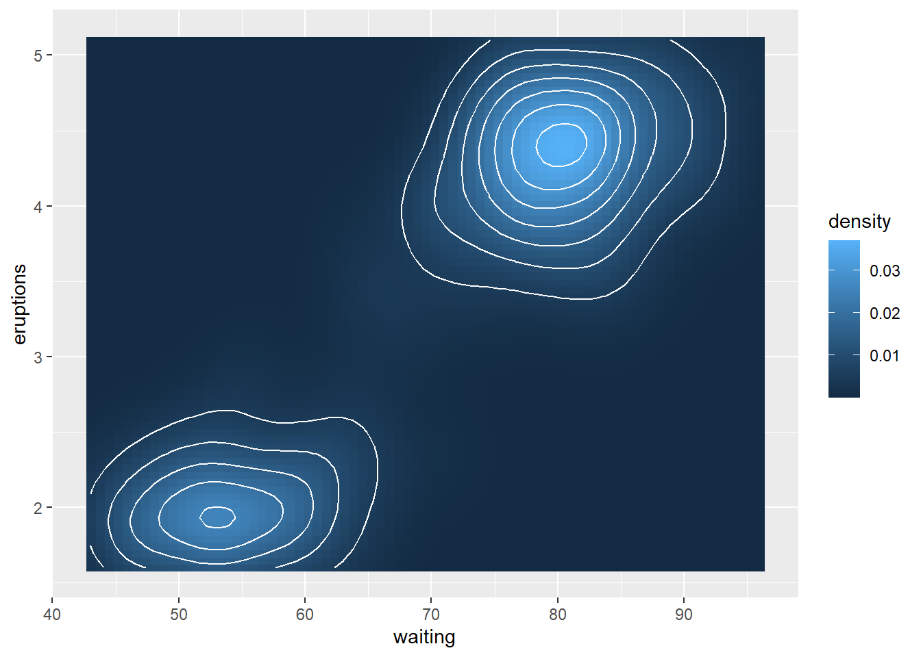 p = ggplot(faithfuld, aes(waiting, eruptions, z = density))