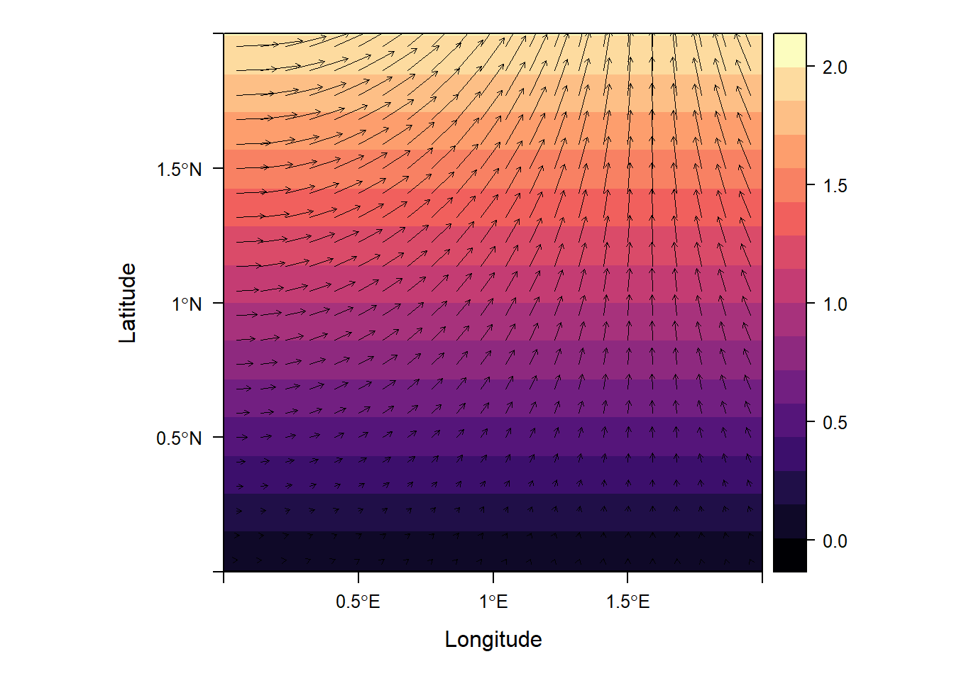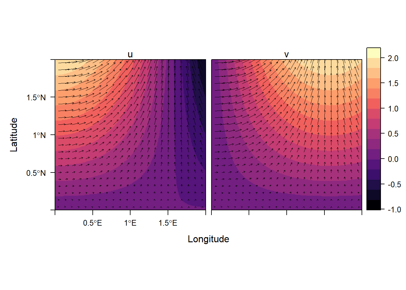 风场数据包括风速和风向,流体动力学数据也包括流速和流向,此类向量场(vector field)或流场(flow field)数据的可视化与标量场不同,一般采用带箭头的线段来进行可视化。在可视化前,一般将通过三角函数将向量(d,\theta)转化为水平和垂直两个方向上的分量(u,v)。ggplot2包中的geom_segment()函数和rasterVis包中的vectorplot()函数以及pracma包中的vectorplot()函数都可以实现向量场数据的可视化。